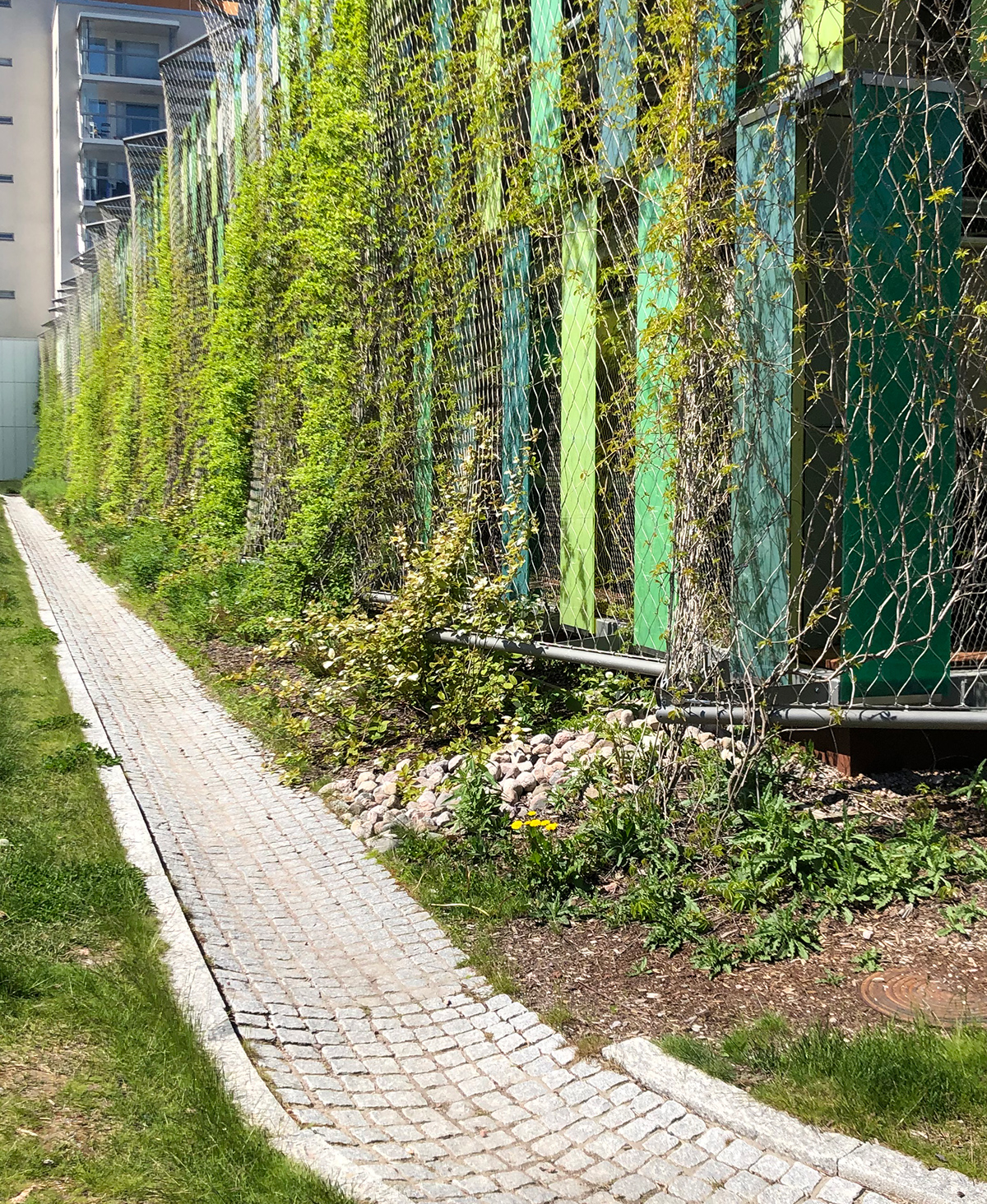 Ohjasimme sadevedet pihalta pysäköintitalon köynnösseinää pitkin kasvualustaan. Hulevedet suodattuvat ja kasvit viihtyvät!
