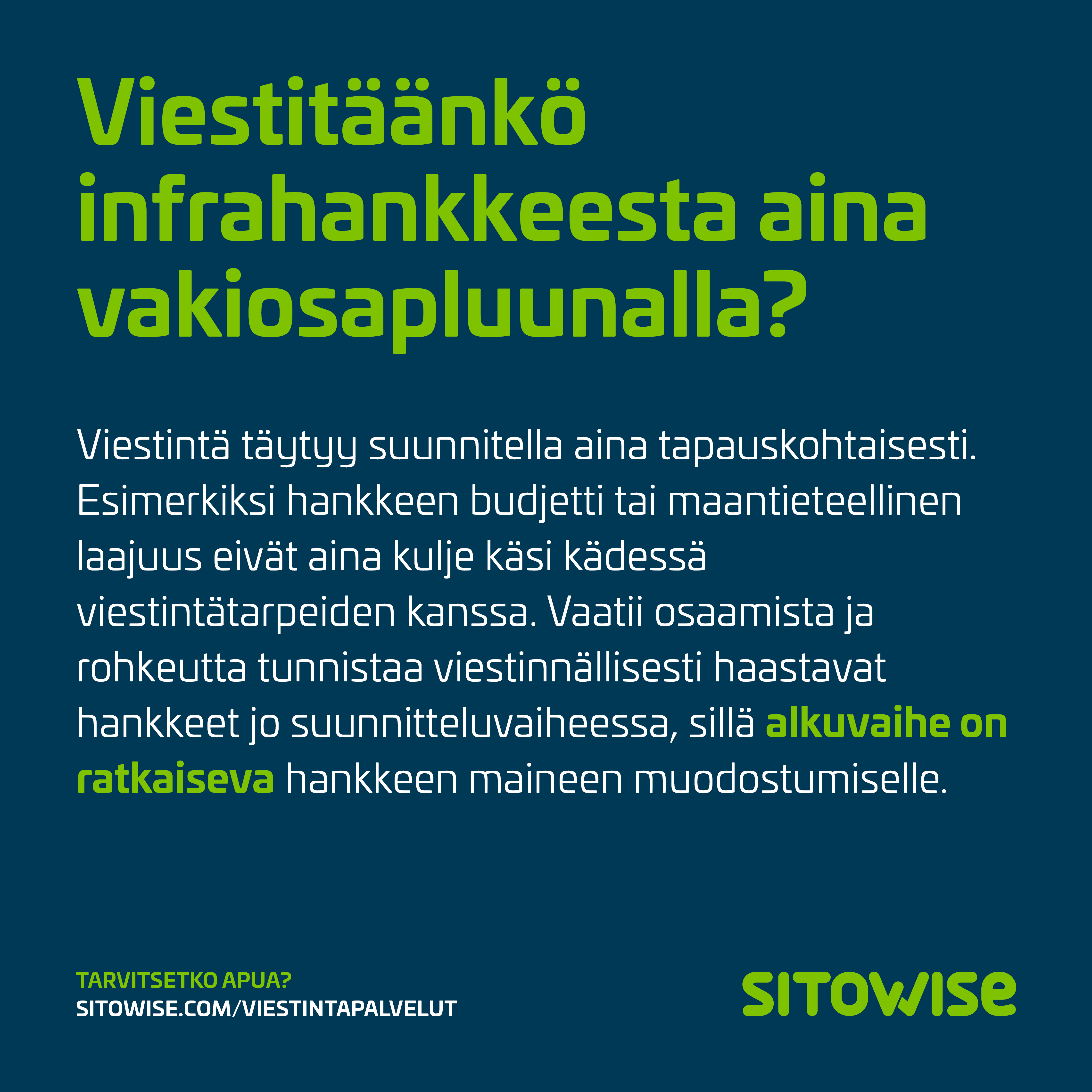 Haluatko hankkeellesi tunnettuutta ja hyvää mainetta? Kaipaatko viestintään tukea ja rakennetta? Viestinnän keinoin saavutetaan hankkeelle laajempi hyväksyntä sidosryhmien keskuudessa - jo suunnitteluvaiheessa.